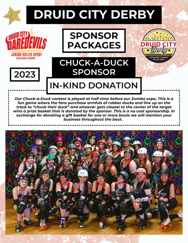 Our Chuck-a-Duck contest is played at half-time before our Zumba expo. This is a fun game where the fans purchase armfuls of rubber ducks and line up on the track to “chuck their duck” and whoever gets closest to the center of the target wins a prize basket that is donated by the sponsor. This is a no cost sponsorship. In exchange for donating a gift basket for one or more bouts we will mention your business throughout the bout.