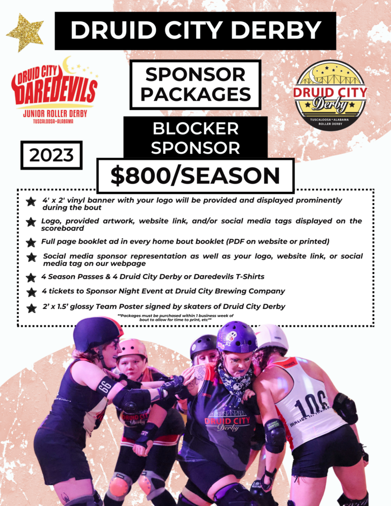 Join the fastest growing sport for people of all ages — and promote to DCD fans! Review our packages below and let us know how we can help YOU. Email us today at dcdfundraisingcommittee@gmail.com or go directly to our Square site to purchase a package and support local roller derby.